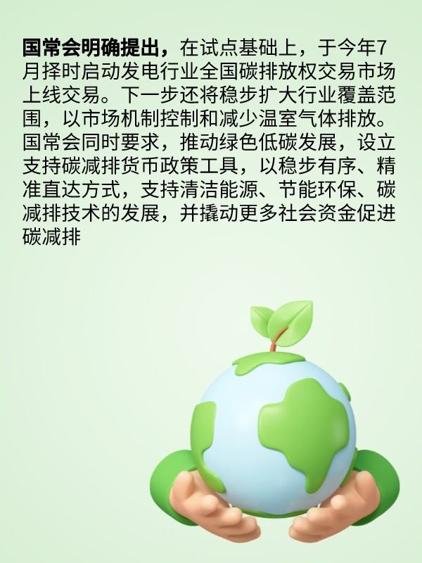 国常会明确提出,在试点基础上,于今年7月择时启动发电行业全国碳排放权交易市场上线交易。下一步还将稳步扩大行业覆盖范围,以市场机制控制和减少温室气体排放。国常会同时要求,推动绿色低碳发展,设立支持碳减排货币政策工具,以稳步有序、精准直达方式,支持清洁能源、节能环保、碳减排技术的发展,并撬动更多社会资金促进碳减排。