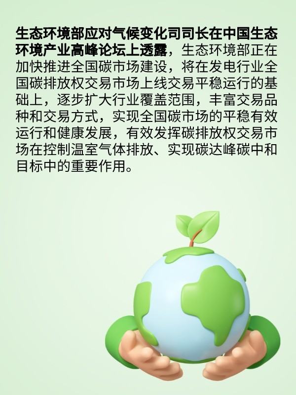 生态环境部应对气候变化司司长在中国生态环境产业高峰论坛上透露,生态环境部正在加快推进全国碳市场建设,将在发电行业全国碳排放权交易市场上线交易平稳运行的基础上,逐步扩大行业覆盖范围,丰富交易品种和交易方式,实现全国碳市场的平稳有效运行和健康发展,有效发挥碳排放权交易市场在控制温室气体排放、实现碳达峰碳中和目标中的重要作用。