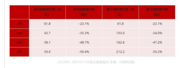 不仅前三甲房企销售额下降明显,今年以来,百强房企累计销售额均值下滑幅度逐月放大,从年初的同比下滑23%直到下滑50%。中指研究院数据显示,1-4月份TOP100房企销售额均值212.2亿元,同比下降50.2%,此外房企单月销售额均值也较1月份有较大幅度下跌。
