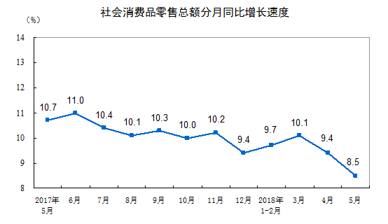 国家统计局近日发布的数据显示,2018年5月份,社会消费品零售总额30359亿元,同比名义增长8.5%(扣除价格因素实际增长6.8%,以下除特殊说明外均为名义增长)。其中,限额以上单位消费品零售额11477亿元,增长5.5%。