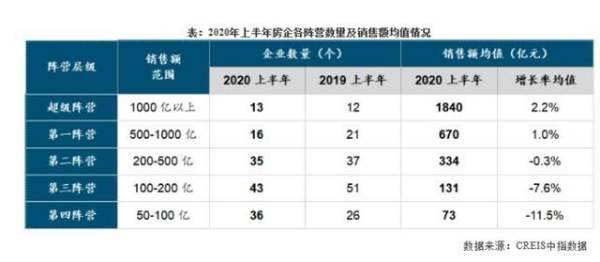 2020年上半年,房企不同阵营的发展策略有所分化。其中1000亿以上超级阵营共13家,销售额增长率均值为2.2%,恒大等企业凭借广泛的布局,多地联动、集中推盘,实现了业绩的稳定发展。