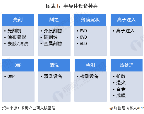 半导体设备,即在芯片制造和封测流程中应用到的设备,广义上也包括生产半导体原材料所需的机器设备。在整个芯片制造和封测过程中,会经过上千道加工工序,涉及到的设备种类大体有九大类,细分又可以划出百种不同的机台,占比较大市场份额的主要有:光刻机、刻蚀机、薄膜沉积设备、离子注入机、测试机、分选机等。
