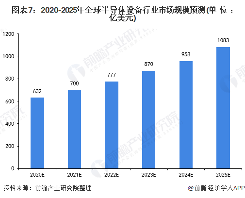从整体来看,尽管受疫情的影响,半导体行业及半导体设备行业依然逆势增长。存储器支出回升、先进制程投资及中国大陆积极推动半导体投资的背景下,预计2020年全球半导体设备市场将持续保持增长,市场规模预计达到632亿美元,同比增长6%;2021年预计达到700亿美元;2025年将超千亿美元。