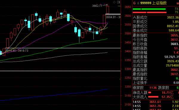 随后这三大板块出现震荡小幅回落,出现冲高回落走势;临近午间收盘之时,抱团股再度全面启动,以有色板块为首,白酒、旅游股、工程机械等集体走高,再度推高大盘指数创下3662点新高。午盘创新高之后,整个午盘都是维持高位震荡,以中阳收市。