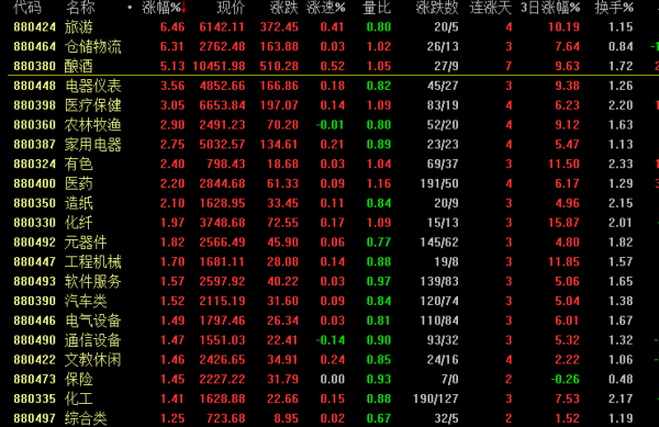 比如开盘是由白酒股带头,保险和金融配合,走着走着各大周期股起来了,有色、煤炭、建材、化工等等,再有就是抱团股白酒、工程机械、旅游等等,这些板块集体走高。