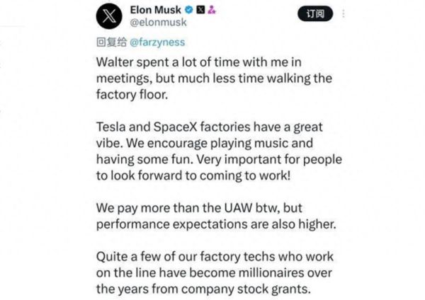 针对美国汽车工会工人罢工事件,特斯拉CEO马斯克也在社交平台发文称:“我们支付的费用比UAW更多,但绩效期望也更高。多年来,我们工厂有不少在生产线上工作的技术人员通过公司派发的股票成为了百万富翁。”