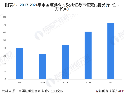 从托管证券市值来看,2017-2021年中国证券公司托管证券市值总体呈上升趋势。2021年中国证券公司托管证券市值为72.54万亿元,较2017年的40.33万亿元增长79.87%。