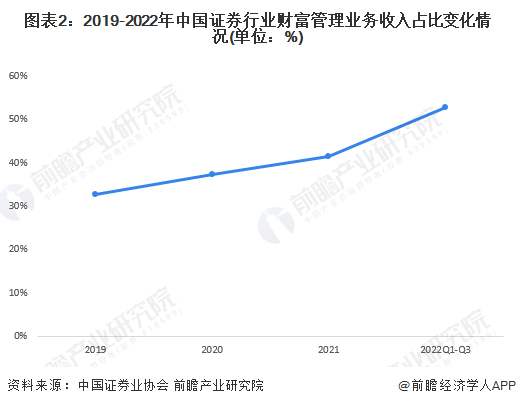 2019-2022Q1-Q3中国证券行业财富管理业务占行业收入比重分别为32.8%、37.4%、41.4%和52.8%,上升约20个百分点,体现中国证券行业持续发力财富管理业务转型。