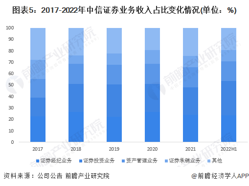 中信证券的规模和业务模式在国内证券行业具有代表性。从中信证券的业务占比来看,2017-2022H1中信证券的财富管理业务(含证券经纪业务和资产管理业务)的营收占比总体上呈上升趋势,2022H1占比约41.18%,较2017年的38.89%上升约2.29个百分点。此外,中信证券的自营业务占比也稳步上升,从2017年的16.34%上升至2022H1的29.85%。而投行业务的占比总体呈下降的趋势。