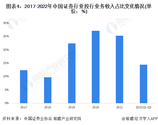 投行业务方面,2017-2022年中国证券行业投行业务营收占比总体上保持波动的状态。2022Q1-Q3中国证券行业投行业务营收占比为14.66%,较2021年的25.23%下滑10.57个百分点,主要系受到新冠疫情升级以及股票发行市场遇冷的影响。
