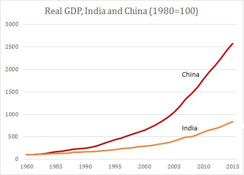 中国的国内生产总值为11.4万亿美元(2016年国际货币基金组织),印度的国内生产总值为2.25万亿美元(2016年国际货币基金组织)。这两个经济体完全没有可比性。中国经济是印度的5倍还多,按人均来算,中国的富裕程度也是印度的5倍。