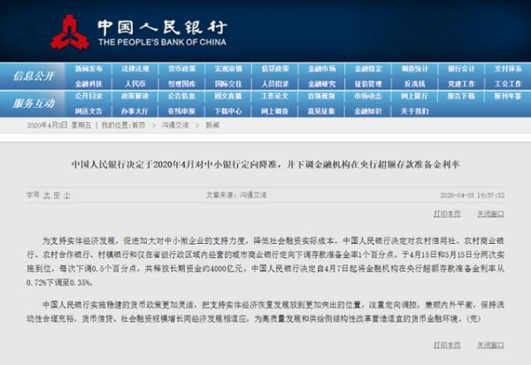 4月3日,央行发布消息称,为支持实体经济发展,促进加大对中小微企业的支持力度,降低社会融资实际成本,决定对农村信用社、农村商业银行、农村合作银行、村镇银行和仅在省级行政区域内经营的城市商业银行定向下调存款准备金率1个百分点,共释放长期资金约4000亿元。除定向降准外,央行决定自4月7日起将金融机构在央行超额存款准备金利率从0.72%下调至0.35%,这也是央行时隔12年下调超额存款准备金利率。