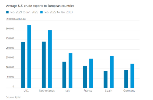 从能源市场的角度来看,由于俄罗斯让出了欧盟大部分市场,美国正“趁虚而入”,据白宫的数据,去年美国对欧天然气出口量增加了一倍多,另外,美国原油产量激增也有助于稳定欧洲市场。