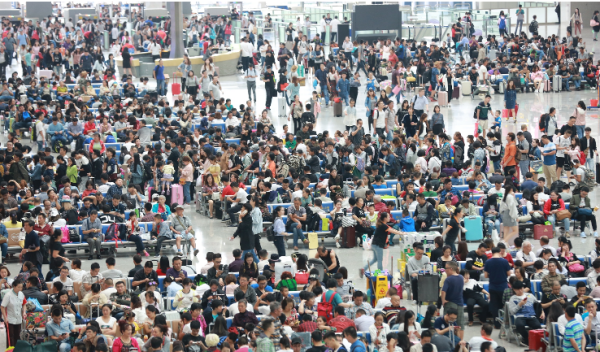 2017年9月30日,旅客在重庆北站北广场等候乘车出行。国庆中秋长假即将来临,重庆铁路迎来了长假前的客流高峰,大批旅客涌进火车站。在重庆火车北站北广场候车大厅内人山人海,场面壮观。