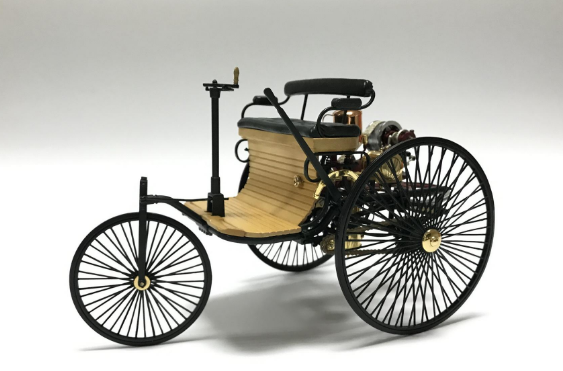 1885年,他在曼海姆制成了第一辆本茨专利机动车,该车为三轮汽车,采用一台二冲程单缸0.9马力的汽油机,此车具备了现代汽车的一些基本特点,如火花点火、水冷循环、钢管车架、钢板弹簧悬架、后轮驱动前轮转向和制动手把等。