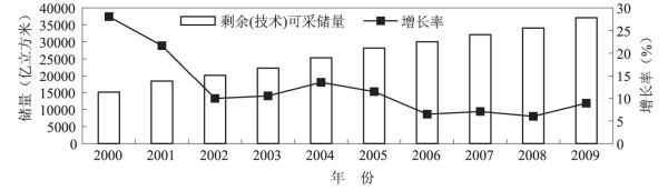 图3 2000~2009年我国天然气剩余(技术)可采储量变化