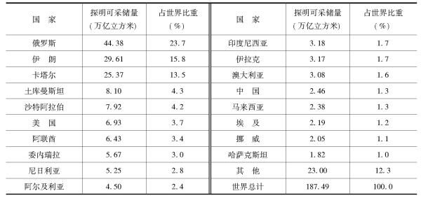 表1 2009年世界主要国家天然气资源储量分布