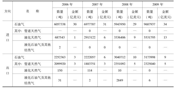 2009年,石油气及其他烃类气(简称液化石油气,下同)进口量达969万吨,比2008年增长63.0%;进口金额为约34亿美元,比上年增长16.4%;减去出口317万吨,2009年我国液化石油气净进口652万吨。我国石油气主要以进口为主,在近十几年,只有1997年出现了净进负值,主要是由于1996年经济泡沫的影响,此后几年中净进口量总体上保持增长的势头(表11)。近几年我国LNG进口方面也有了新的发展。2006年我国首批进口的液化天然气进入广东省的液化天然气接收终端;2007年广东LNG项目正式投入商业运营,该年我国进口LNG291万吨,是2006年进口量的3倍多,其中248万吨为澳大利亚西北大陆架项目的长期合同供货,约占进口总量的85%,平均价格为206.16美元/吨。2009年我国液化天然气进口量达553万吨,同比增长65.8%,进口金额为12.87亿美元,同比增长38.2%。