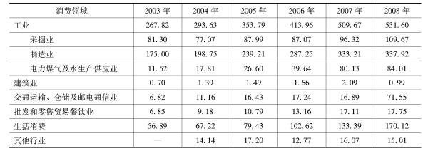 2009年,我国天然气表观消费量为874亿立方米,增长8.3%。加上国内经济继续保持稳健的步伐,能源消费需求也将不断攀升,作为能源发展的一个重要组成部分,天然气消费量也将进一步增加。“九五”期间,天然气的消费增长量是101.7亿立方米,年均增长率为9.57%;“十五”期间消费增长量已高达246.4亿立方米,年均增长率高达12.91%。统计数据显示,2008年我国天然气消费主要集中在工业领域,占全部消费量的65.4%,这个巨大的消费量主要由其下的制造行业产生,达到337.92亿立方米。其次是采掘业,达到109.67亿立方米,但从发展趋势看,采掘业在消费中所占比重已在减少。除工业部门外,生活消费领域也有170.12亿立方米的消费量,同比出现很大幅度增长(27.54%)(表6)。从天然气消费领域的比重上分析得出,除建筑业消费比重在降低,其他领域的消费量都在增长。从消费地区结构上看,我国天然气消费以产地消费为主,主要集中在西南、东北、西北地区,即四川、黑龙江、辽宁、新疆,占全国消费量的80%以上。目前,随着管道建设的开展,北京、天津、重庆、成都、沈阳、郑州和西安等许多大中城市都用上了管道天然气。