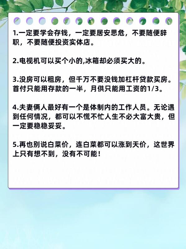 1.一定要学会存钱,一定要居安思危,不要随便辞职,不要随便投资实体店。