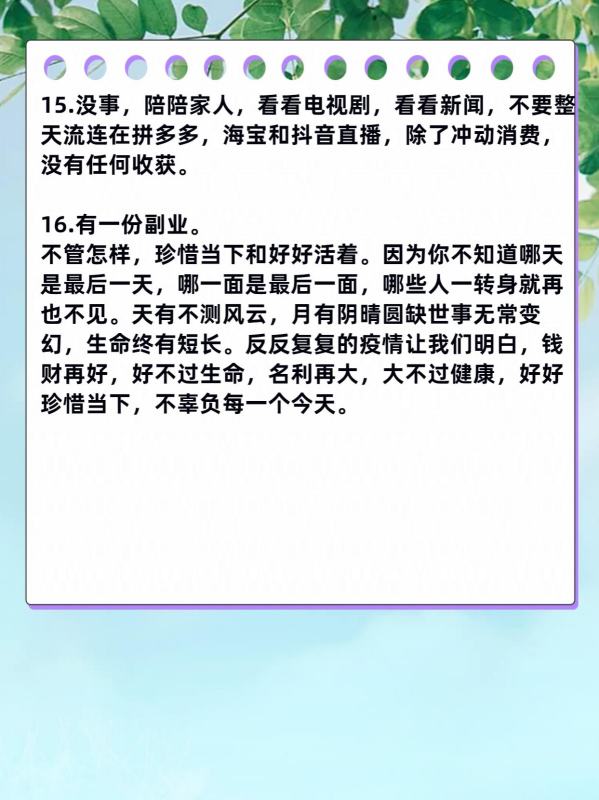 15.没事,陪陪家人,看看电视剧,看看新闻,不要整天流连在拼多多,海宝和抖音直播,除了冲动消费,没有任何收获。
