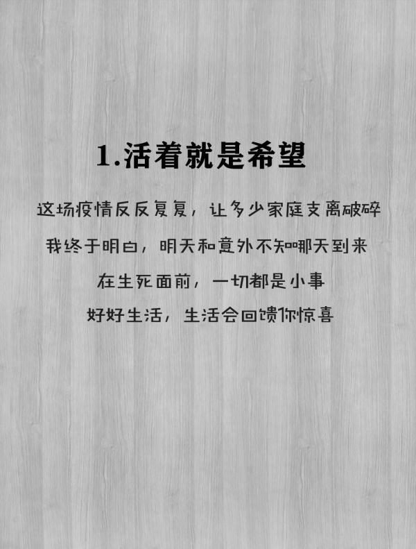 不管怎样,珍惜当下和好好活着。因为你不知道哪天是最后一天,哪一面是最后一面,哪些人一转身就再也不见。天有不测风云,月有阴晴圆缺世事无常变幻,生命终有短长。反反复复的疫情让我们明白,钱财再好,好不过生命,名利再大,大不过健康,好好珍惜当下,不辜负每一个今天。