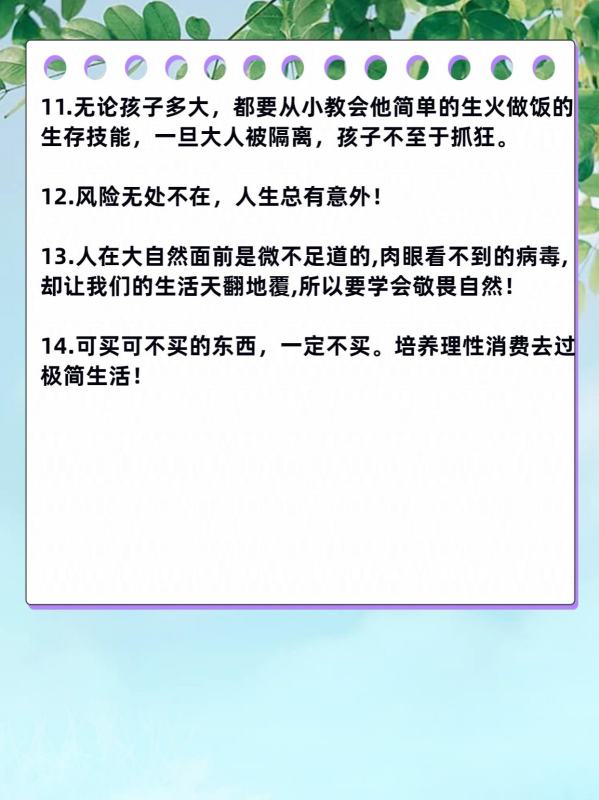 13.人在大自然面前是微不足道的,肉眼看不到的病毒,却让我们的生活天翻地覆,所以要学会敬畏自然!