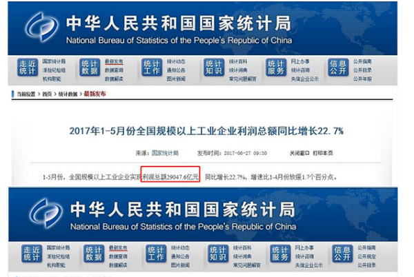国家统计局还表示,规模以上工业企业利润总额与财政部的国有企业数据和上市公司财务季报数据总体趋势一致,是反映企业实际情况的。1-5月份,财政部发布的国有企业利润总额同比增长20.9%,国内增值税同比增长19%;一季度A股非金融企业净利润增速为23.6%。