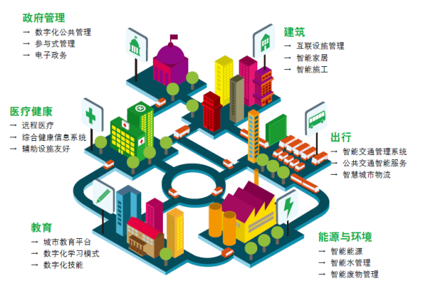 罗兰贝格大致将智慧城市涵盖的领域分为六大部分,包括政府管理、出行、能源与环境、医疗健康、教育、建筑等。