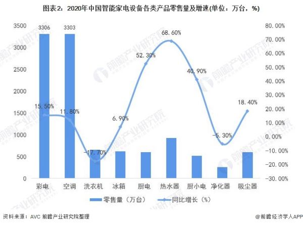 从整体市场需求情况来看,根据奥维云网(AVC)统计数据显示,2020年中国智能家电设备市场零售量整体呈现增长,其中,智能电视的零售额最大为3306万台;智能空调的零售量紧跟其后为3303万台;热水器、厨电和厨小电的零售量增长较快;而智能洗衣机和智能净化器的零售量同比下降。