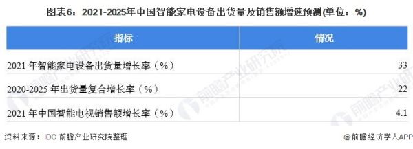 从未来发展前景来看,IDC预测数据显示,2021年中国智能家电设备出货量增长率预计在33%左右,2020-2025年出货量复合增长率预计在22%左右,而2021年中国智能电视销售额的增长率将放缓至4.1%,中国智能家电设备未来出货量的增长主要是基于智能小家电领域的市场需求增加。