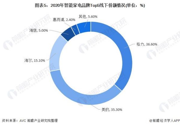 从智能家电设备供应格局情况来看,中国传统家电厂商在智能家电领域具备显著竞争优势,无论是线上渠道还是线下渠道,美的、格力、海尔三家企业均占据较高的市场份额。2020年,中国智能家电线上市场中,前五大品牌依次为美的、格力、海尔、奥克斯和海信,分别占据36.7%、27.4%、11.7%、11.6%和2.8%的市场份额;线下渠道格力为市场份额最大的品牌,占比达36.6%,美的以35.3%的市场占比紧随其后。