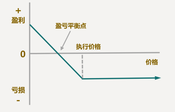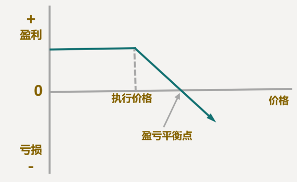 同样的,有人买入看跌期权,就有人卖出。如果股价下跌,买方赚钱,卖方就会亏损,跌的越多,亏损越多;如果股价上涨,看跌期权失效,卖方赚一个期权费。看跌期权卖方的盈亏示意图如下图所示: