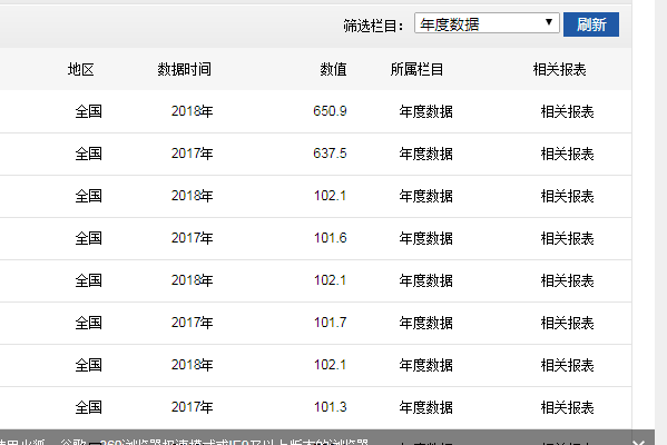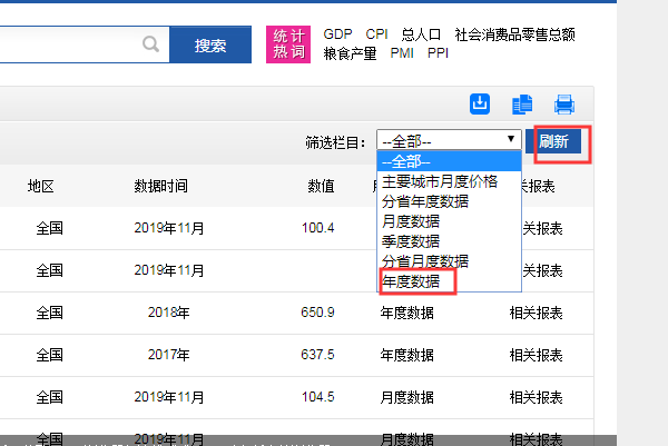 4、页面跳转以后,点击下面的帅选栏目选择年度数据,点击刷新就可以看到各年公布的CPI数据了。