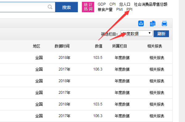 6、如需要查询PPI数据,则在该页面中点击PPI,选择年度数据就可以查询到相应的数据了。