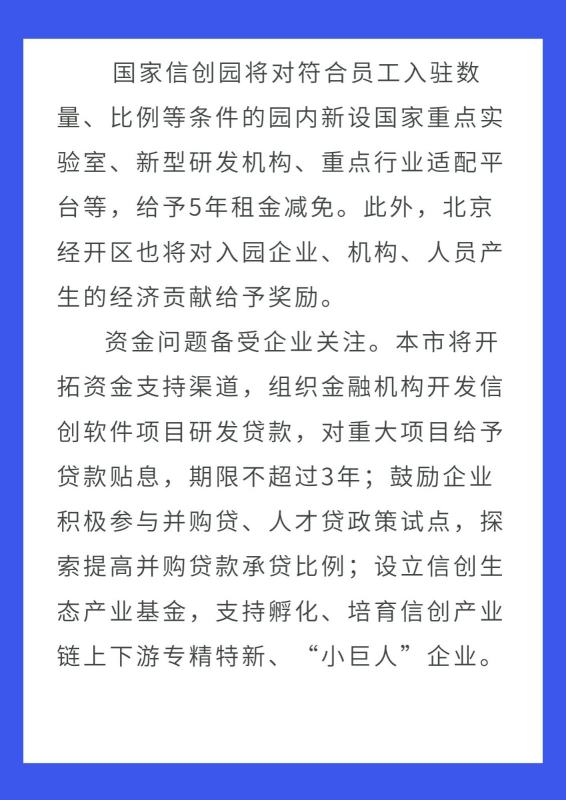 国家信创园将对符合员工入驻数量、比例等条件的园内新设国家重点实验室、新型研发机构、重点行业适配平台等,给予5年租金减免。此外,北京经开区也将对入园企业、机构、人员产生的经济贡献给予奖励。