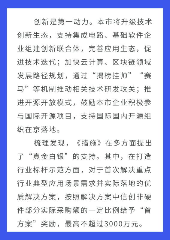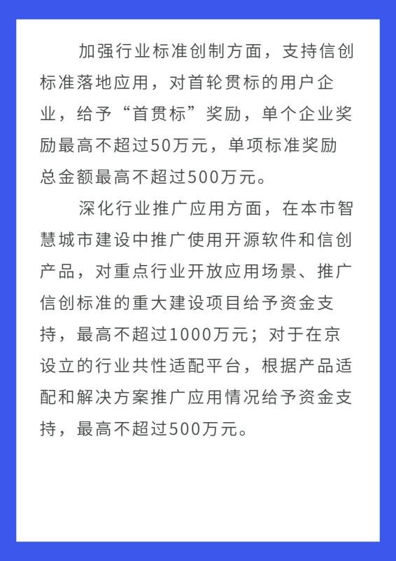 深化行业推广应用方面,在本市智慧城市建设中推广使用开源软件和信创产品,对重点行业开放应用场景、推广信创标准的重大建设项目给予资金支持,最高不超过1000万元;对于在京设立的行业共性适配平台,根据产品适配和解决方案推广应用情况给予资金支持,最高不超过500万元。