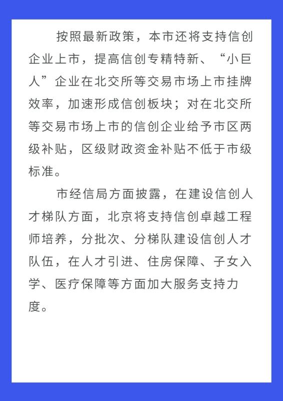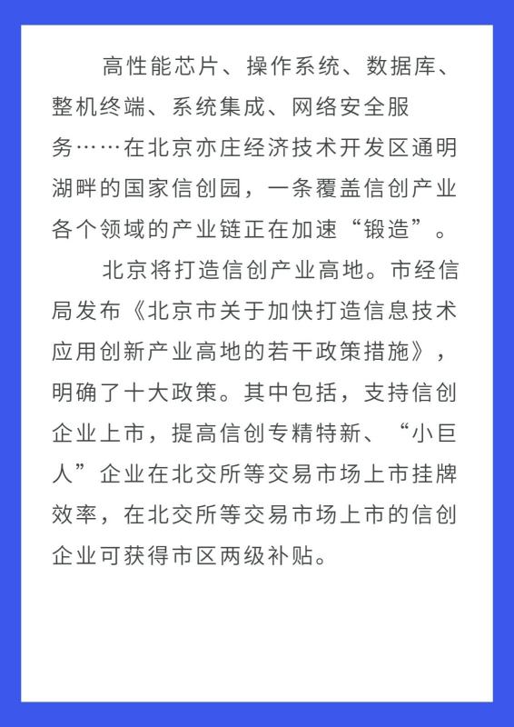 北京将打造信创产业高地。市经信局发布《北京市关于加快打造信息技术应用创新产业高地的若干政策措施》,明确了十大政策。其中包括,支持信创企业上市,提高信创专精特新、“小巨人”企业在北交所等交易市场上市挂牌效率,在北交所等交易市场上市的信创企业可获得市区两级补贴。