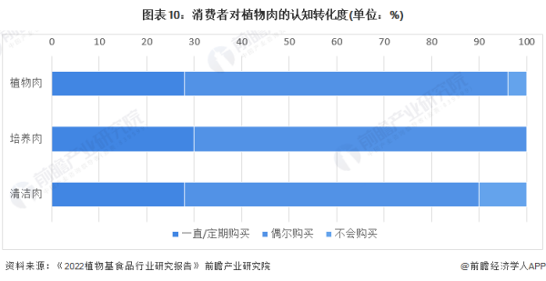 调查结果都显示,在尝试了植物肉后,28%的人会表示一直/定期购买,68%的人表示会偶尔购买,4%的人表示不会购买;清洁肉不会购买的人占10%,偶尔购买的人占32%。