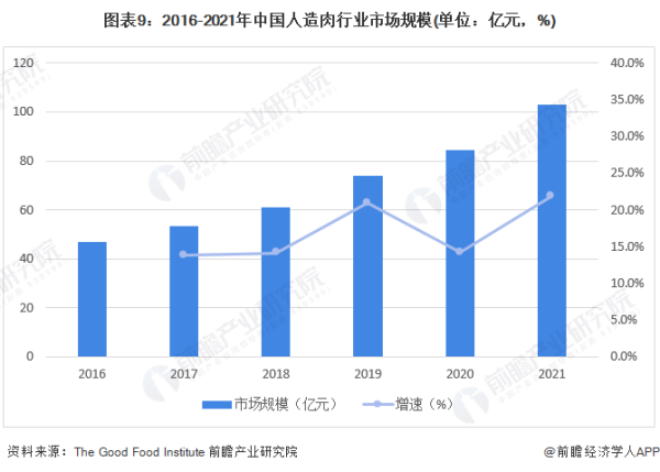 Good Food Institute,中国植物肉产业的年复合增长率为14%左右,初步核算,2021年市场规模增长至103亿元左右。
