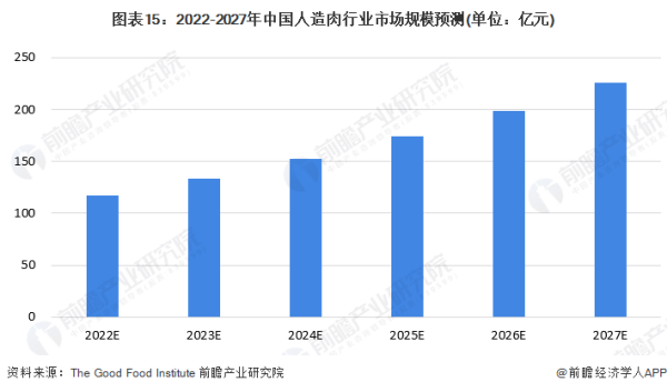 Institute的测算,中国人造肉市场的年复合增长率在14%左右,前瞻初步核算2022-2027年我国人造肉市场将从117增长到226亿元。