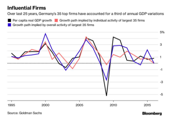 维尔内通过计算显示,德国排名前35位的公司个体经营活动的好坏可以给德国国内生产总值(GDP)造成的变动多达30%。此外,上述公司中很大一部分都集中在汽车行业,这些公司表现的好坏不但可以造成国内生产总值15%的波动,而且还占到经济总体增值的10%左右。