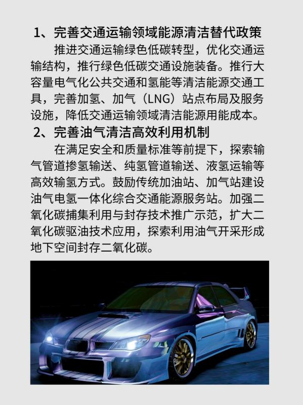 1、完善交通运输领域能源清洁替代政策推进交通运输绿色低碳转型,优化交通运输结构,推行绿色低碳交通设施装备。推行大容量电气化公共交通和氢能等清洁能源交通工具,完善加氢、加气(LNG) 站点布局及服务设施,降低交通运输领域清洁能源用能成本。