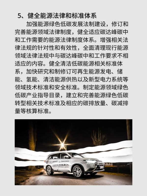 5、健全能源法律和标准体系加强能源绿色低碳发展法制建设,修订和完善能源领域法律制度,健全适应碳达峰碳中和工作需要的能源法律制度体系。增强相关法律法规的针对性和有效性,全面清理现行能源领域法律法规中与碳达峰碳中和工作要求不相适应的内容。健全清洁低碳能源相关标准体系,加快研究和制修订可再生能源发电、储能、氢能、清洁能源供热以及新型电力系统等领域技术标准和安全标准。制定能源领域绿色低碳产业指导目录,建立和完善能源绿色低碳转型相关技术标准及相应的碳排放量、碳减排量等核算标准。