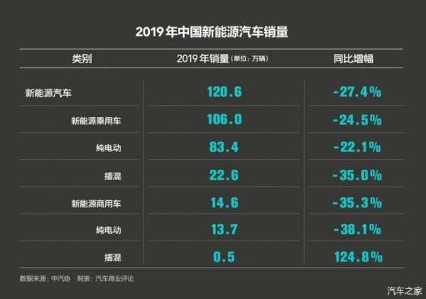 而根据中国汽车工业协会的数据,2019年,新能源汽车产销分别完成124.2万辆和120.6万辆(新能源乘用车全年销量106万辆,同比下降24.5%),同比分别下降2.3%和4.0%。