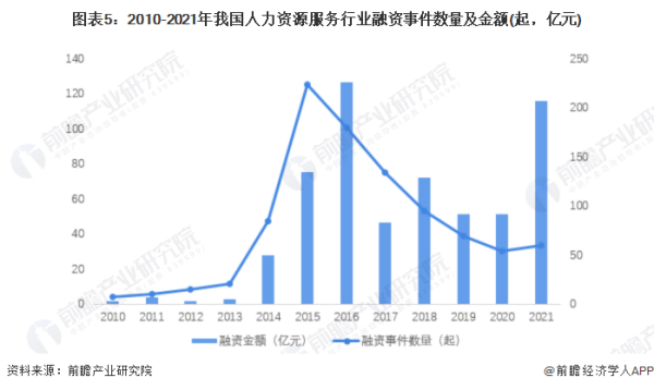 根据IT桔子统计数据,2014年起,我国人力资源服务行业融资事件数量和融资金额均显著增加。2016年融资金额达到顶峰,为126.56亿元,2015年融资事件数量达到顶峰,为223起。2021年全年我国人力资源服务行业融资事件数量为60起,融资金额达115.63亿元,较2020年均有所提高。