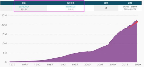 如上图,这是近几十年以来美国债务走势图,确实是一年不一年高,截止5月份美国总债务约为25.75万亿美元,而4月份美国总债务约为24.97万亿美元,在短短1个月时间里面已经增加了0.78万亿美元。