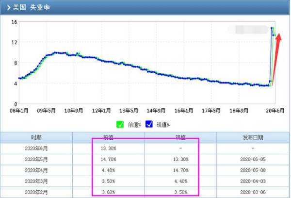 美国疫情是3月份开始爆发的,随着4月份开始加剧,美国失业率就开始飙升了,4月份失业率为4.40%,5月份的失业率是14.70%,6月份的失业率是13.30%,美国失业率还在持续的走高。