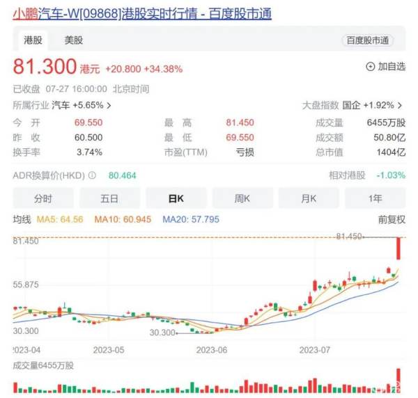 并且就在7月26日当晚,小鹏汽车美股股价一度涨超40%,收获年内迄今最高涨幅,截至美东时间7月26日收盘,小鹏汽车报收27.2亿美元/股,同比增长26.69%。7月27日,小鹏汽车港股开盘后一度涨近30%。