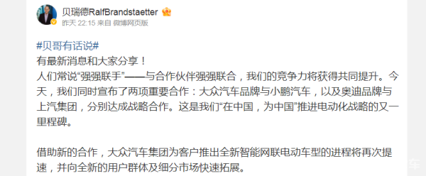 在7月26日晚,大众汽车集团负责中国区业务的管理董事贝瑞德(Ralf Brandstaetter)发了一条微博说道:“今天,我们同时宣布了两项重要合作:大众汽车品牌与小鹏汽车,以及奥迪品牌与上汽集团,分别达成战略合作。这是我们‘在中国,为中国’推进电动化战略的又一里程碑”。